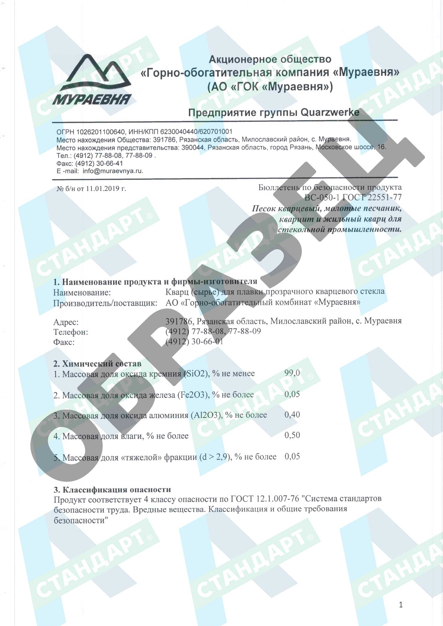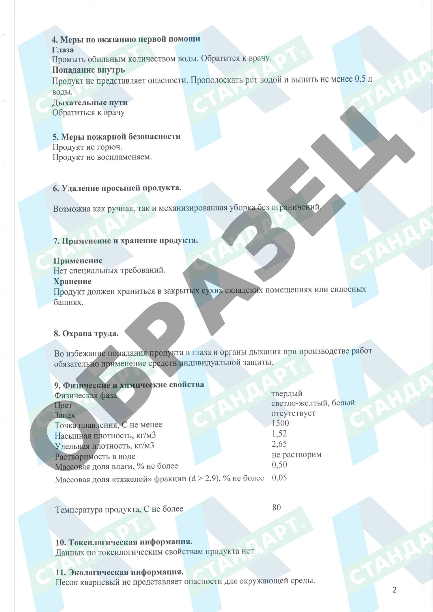 | Состав | оксид железа Fe2O3 - 0,05% / диоксид кремния SiO2 - 99,00% / оксид алюминия Al2O3 - 0,40% / тяжелая фракция < 0,05% | |