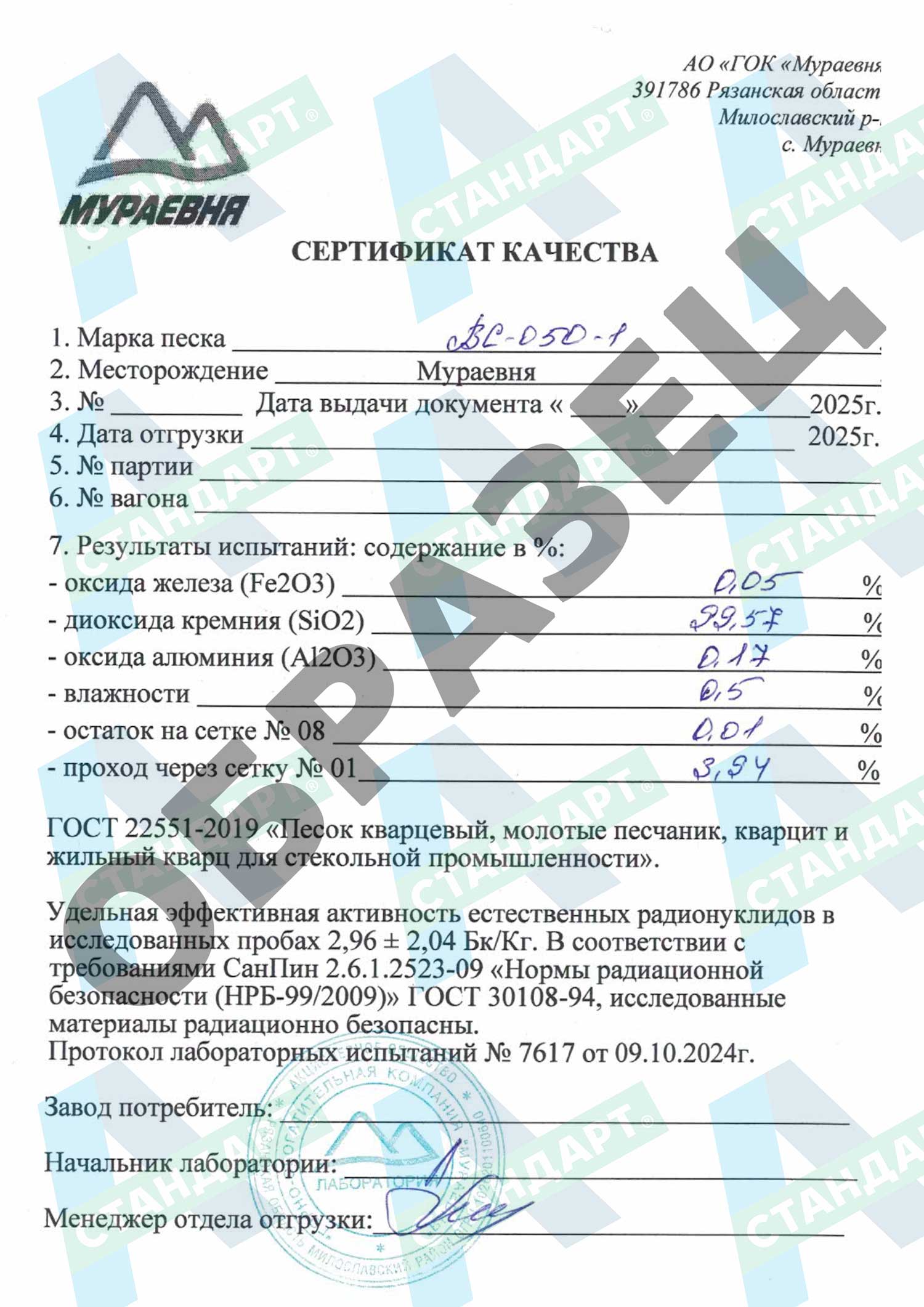 1. Контроль качества по ГОСТ 2138-91 и ГОСТ 22552-2017. Каждая партия тестируется в лаборатории на: - Гранулометрический состав (точность фракции); - Содержание SiO₂ и оксидов железа; - Радиоактивность (1-й класс безопасности); - Насыпную плотность и влажность.