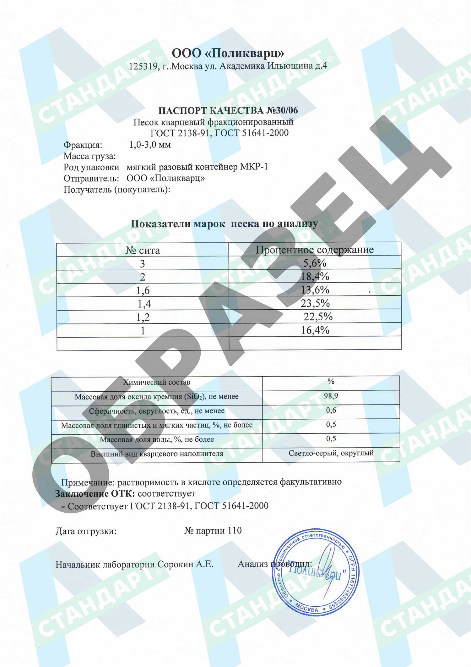 | Состав | кварцевый песок 100% | |