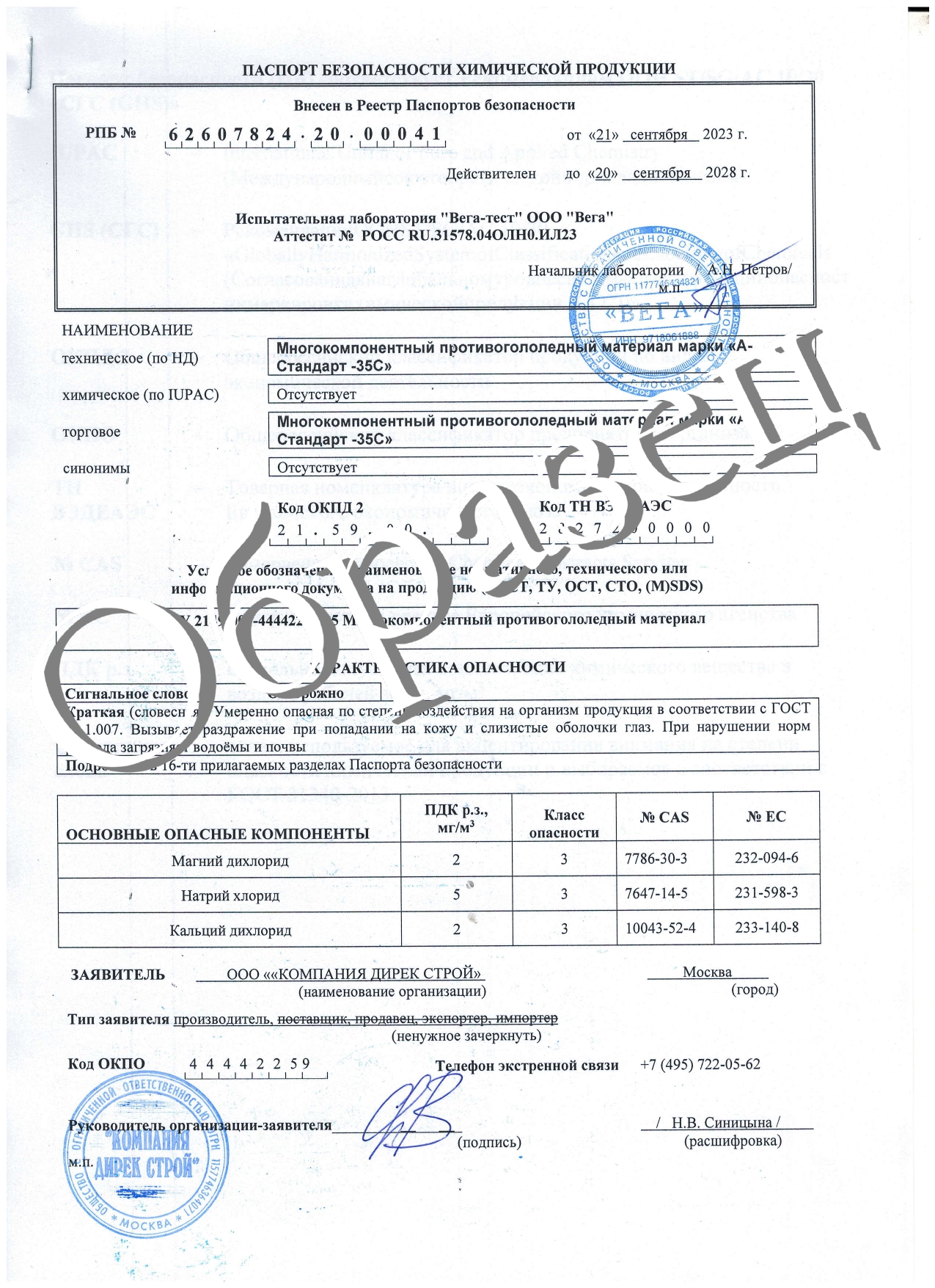 | Состав | Хлорид натрия технического 60% / Хлорид кальция технического 20% / Хлорид магния 20% | |